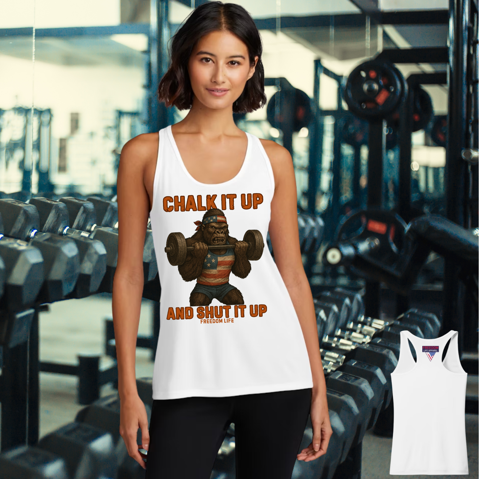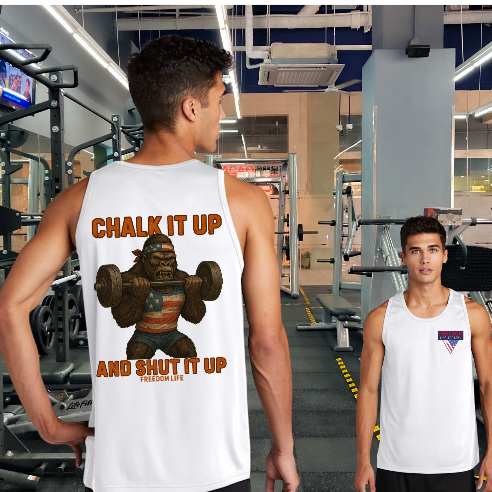 When it’s time to lift, there’s no room for excuses. The Chalk It Up and Shut It Up tank brings the heat with Peewee, Freedom Life Apparel’s powerhouse gorilla mascot, staring down the weight rack in full red-white-and-swole glory.