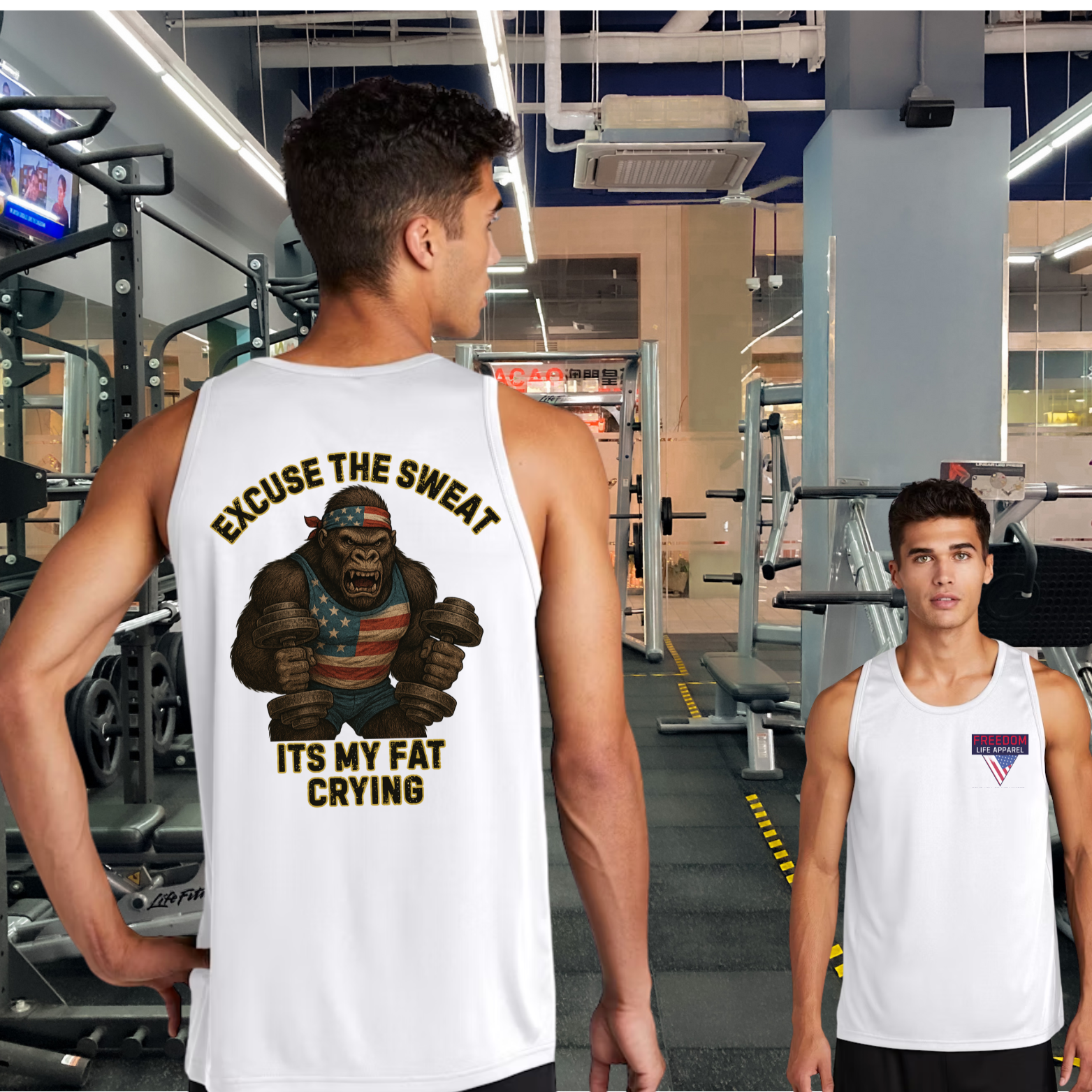 Bring the heat and the humor with our Excuse the Sweat – It’s My Fat Crying performance tank. This bold design features Peewee, Freedom Life Apparel’s red-white-and-swole gorilla mascot, rocking his patriotic gym gear and hoisting dumbbells with pure intensity.