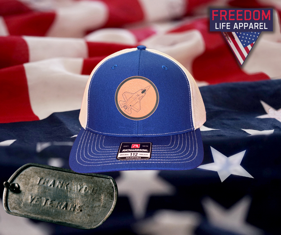 The F35 (Circle) Hat features the unmistakable top-down outline of the F-35 Raptor—engraved into premium rawhide leather and encircled in a bold, clean design. This hat is a tribute to the most advanced stealth fighter in the world and the elite pilots who command it.