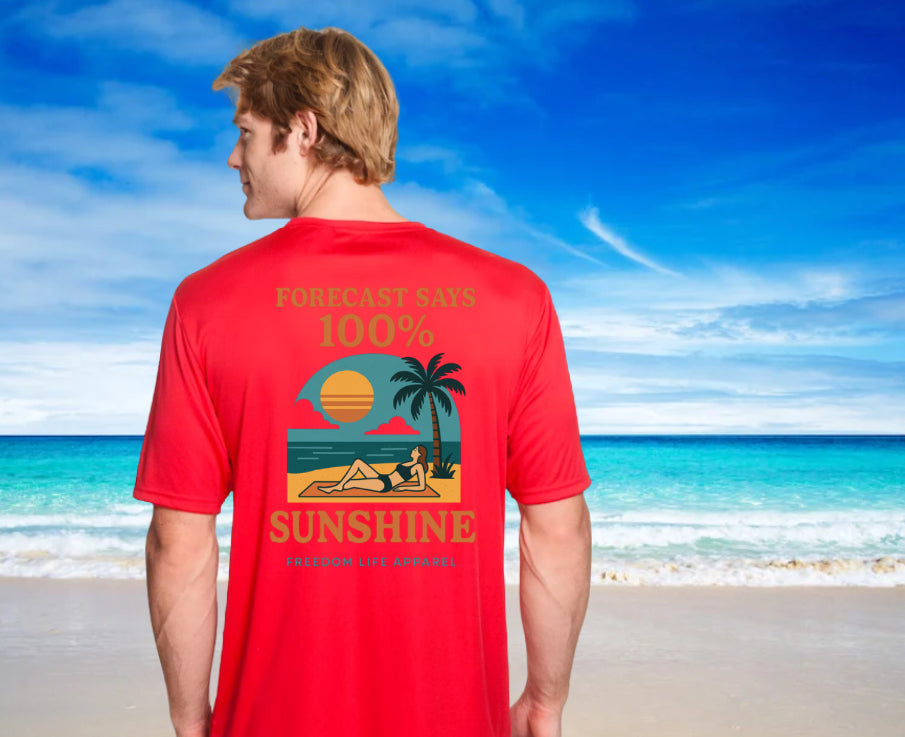 Bring the beach vibes everywhere you go with the Freedom Life “Forecast Says 100% Sunshine” Shirt. Featuring a retro-inspired sun and surf design, this lightweight performance tee is made for sun chasers, ocean lovers, and anyone who believes life is better with sand between your toes. Quick-drying and breathable, it’s perfect for beach days, boat trips, or just soaking up the good vibes.