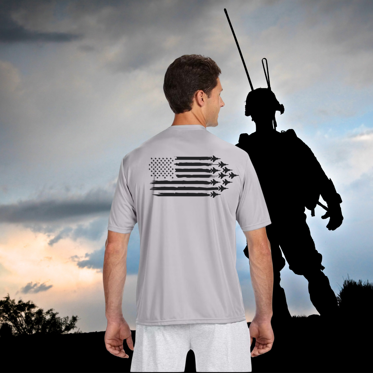Fly together. Stand united. The Formation Flag Shirt from Freedom Life Apparel captures the essence of American pride and precision aviation. Featuring a sleek design of fighter jets soaring in tight formation, transforming into the American flag itself, this shirt symbolizes strength through unity and freedom through service.