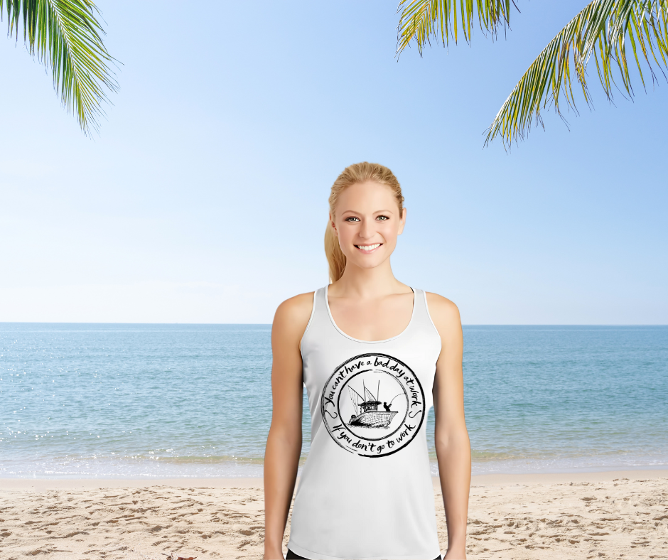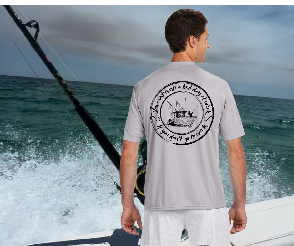 Set sail from spreadsheets and drift far from deadlines with the Freedom Life Apparel “No Bad Day at Work” shirt. Perfect for anglers, boaters, beach bums, and anyone whose dream job involves a rod, reel, and a cold one in hand. This performance fishing tee features a bold back design with a saltwater boat and the hilarious mantra: