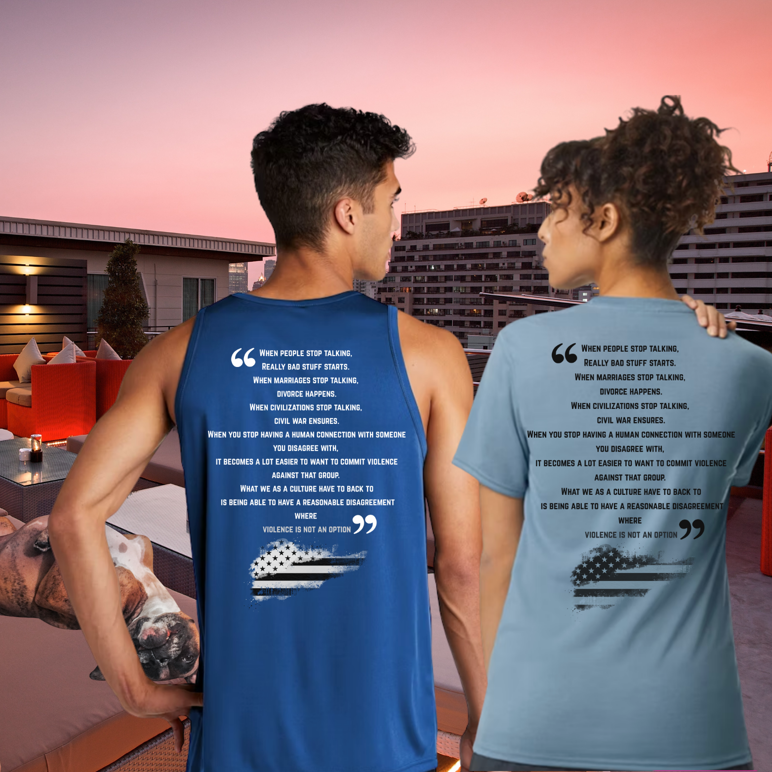 Stand for peace, strength, and unity with our Violence is Not an Option apparel. This bold design features a powerful message that reminds us all of the importance of communication, respect, and finding common ground in a divided world. Printed on premium-quality t-shirts and tanks, this design blends comfort, durability, and meaning.